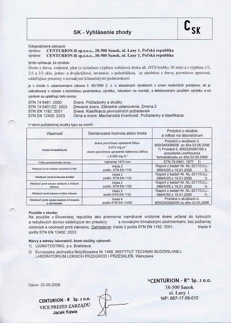 Certifikát - dvere 110